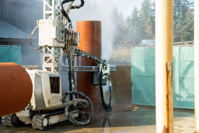Walco Industries Ltd. brings one of North America's largest and most capable robotic hydrodemolition fleets to every project we take on. Our robotic systems are available in both electric and diesel-powered configurations — giving us the ability to match the right equipment to the demands of any site, from enclosed or emissions-sensitive environments to remote locations requiring fully self-contained power. What truly defines our robotic capability, however, is the range of specialized custom tooling we carry. Equipped with attachments including a centralizer unt for precise circumferential work inside pipes or penstocks, a rotating head for revolving jet access in recesses and cavities (providing a shallow but perfect scarified surface), extension kits for deep and elevated hard to reach areas, a rail system for controlled linear runs, a circular power head for full-circumference interior/exterior pipe rehabilitation, a tunnel kit for arched and curved concrete profiles, and a track system with a separate compact controller unit for extended-reach stability and operator precision — Walco's robotic fleet is configured to work where others can't. Whether the project involves a standard bridge deck, a vertical dam face, a narrow penstock, or a complex tunnel lining, we have the equipment and the expertise to execute it with the accuracy, safety, and quality our clients expect.